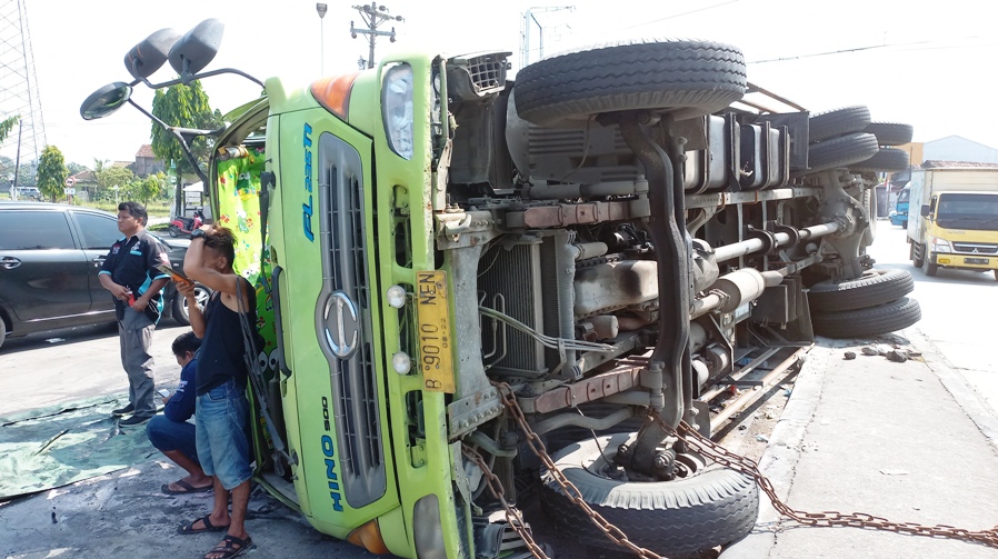 Akhirnya dia banting setir. Truk oleng. Kemudian mengenai median jalan dan terguling.