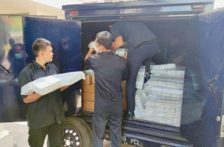 Petugas mengangkat plastik berisi uang pecahan baru, persiapan pengiriman di Kantor Perwakilan (Kpw) Bank Indonesia (BI) Tegal, Rabu (6/4/2022).