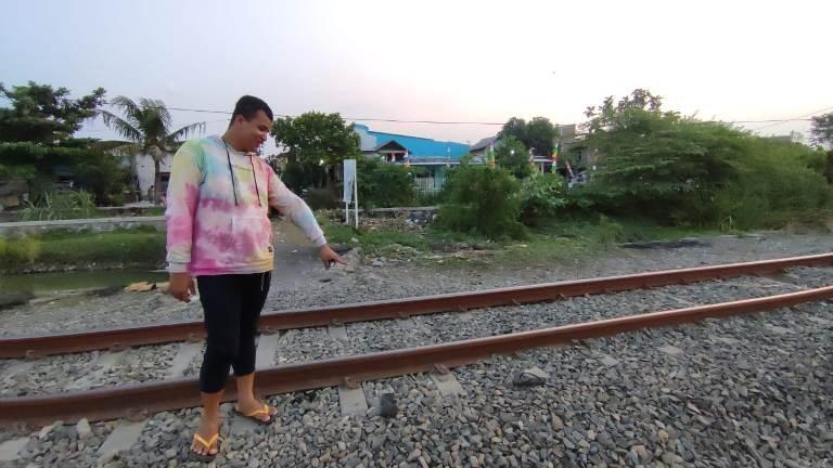 Korban tak sadar bahwa ada kereta penumpang melintas dari arah barat ke timur.