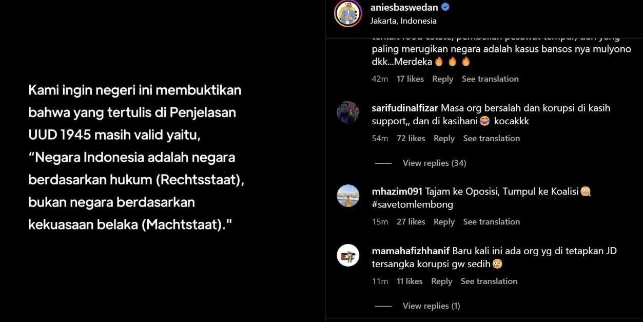 Anies Baswedan mengaku kaget Tom Lembong jadi tersangka korupsi. Netizne menyebut, aparat penegak hukum tajam ke opsisi, tapi tumpul ke koalisi.